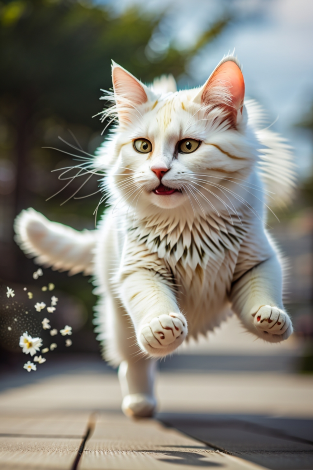 A playful white cat leaping through the air, its fur billowing in the wind(04)
